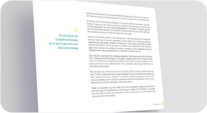 ers performing transactions, out of which Mexico registered 2 million active users in 2017. Mexico is the most important market for PayPal in Latin America (PayPal, 2018). According to the information available in the reporFit nTech: Innovation You did not Know was from Latin America and the Caribbean (IDB and Finnovista, 2017), the FinTech movement is a very recent phenomenon in the region. The report shows that 60% of the participating startups were created three years ago or less, and only 18% stated having been created more than ive years ago. The FinTech adoption rate When television was created, it was thought that it was the end of movies; when the is barely 33%, which indicates Internet was born, it was said newspapers would come to an end. The predictions regarding any signiicant change or revolution, in any industry, have always been that this type of company still has much fatalistic speculation. There are often a lot of false ideas about how technology will to do to cement themselves. impact the current state of affairs, however, in practice, these supposed paradigm changes never substitute completely to the state of the previous art. This was also experienced by the inancial industry following the arrival of FinTechs. Why? Because the old paradigm is still useful and generates value. The new and old inancial models exist alongside one another: while some consumers adopt the new inancial services, there will always be other consumers continuing to ind value in the traditional proposal. The adoption rate of FinTech is barely 33% (EY, 2017) worldwide, which indicates that FinTech companies have a long road ahead to position themselves among the most conservative users. However, it is dificult to know how long these users will continue looking at both sides: the old model which they are familiar with and new inancial services that may offer a better alternative. While it is impossible to predict what the future of the inancial industry will be in the next ten years, the banking sector is learning to cohabit with FinTechs in a market dynamic different from the usual, where the forces of competition and collaboration only came from other banks. A TWO-WAY PATH14
