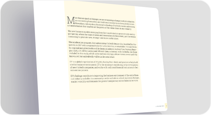 ore than an epoch of changes, we are witnessing a change in which industries are reinventing themselves and traditional boundaries are being broken down. MNowadays, talking about inancial technology (FinTech) means addressing a transformation that touches all the points of the value chain in any industry. The new business models emerging from this transformation generate risks and op - portunities, where the trade of some and innovation of others meet, just like metals combining to generate new, stronger and more useful alloys. The acceleration program, Startupbootcamp FinTech Mexico City, launched by Fin- novista in 2017 with a regional focus for Latin America, is remarkable. It is a platform for regional and global leaders of the inancial industry such as Visa, Gentera, Banre- gio, HSBC, EY, IGNIA, Latinia and White & Case, to interact with FinTechs, like those included in this study, which are brand new startups, whose names are not publicly known yet, but undoubtedly will be in the near future. EY is a global organization of 212,000, sharing their ideals and passion to help build a better business environment. EY is the alchemist contributing to the development of new FinTech companies, and works with traditional inancial institutions in their reinvention process. EY’s indings contribute to improving the business environment of the entire inan- cial industry and offer its community a wider outlook on radical regulatory changes, market volatility and demands for greater transparency across inancial services. A TWO-WAY PATH 5