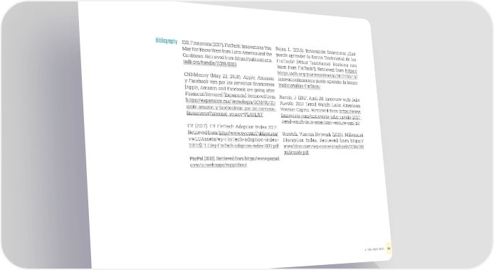 Bibliography IDB, Finnovista (2017). FinTech: Innovations You Rojas. L. (2016). Innovación inanciera: ¿Qué May Not Know Were from Latin America and the puede aprender la Banca Tradicional de las Caribbean. Retrieved from https://publications.FinTech? [What Traditional Banking can iadb.org/handle/11319/8265 learn from FinTech?]. Retrieved from https:// blogs.iadb.org/puntossobrelai/2017/02/16/ CNNMoney (May 22, 2018). Apple, Amazoni nnovacioninanciera-puede-aprender-la-banca- y Facebook van por los servicios inancieros tradicionallas-FinTech/ [Apple, Amazon and Facebook are going after Financial Services] [Expansión]. Retrieved from Ruvolo, J. (2017, April 19). Interview with Julie https://expansion.mx/tecnologia/2018/05/21/ Ruvolo. 2017 Trend Watch: Latin American apple-amazon-y-facebookvan-por-los-servicios- Venture Capital. Retrieved from https://www. inancieros?internal_source=PLAYLIST innovista.com/entrevista-julie-ruvolo-2017- trend-watch-latin-american-venture-capital/ EY (2017). EY FinTech Adoption Index 2017. Retrieved from: http://www.ey.com/Publication/ Scratch, Viacom Network (2015). Millennial vwLUAssets/ey-FinTech-adoption-index- Disruption Index. Retrieved from https:// 2017/$FILE/ey-FinTech-adoption-index-2017.pdf www.bbva.com/wp-content/uploads/2015/08/ millenials.pdf PayPal (2018). Retrieved from https://www.paypal. com/ai/webapps/mpp/about A TWO-WAY PATH20