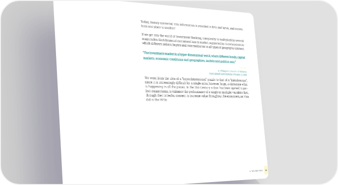 Today, money converted into information is encoded in bits and bytes, and moves from one place to another! If we get into the world of Investment Banking, complexity is multiplied by several magnitudes. Each inancial instrument has its market, supported by its own system to which different sellers, buyers and intermediaries in all types of geography connect. “The investment market is a hyper-dimensional world, where different bonds, capital markets, economic conditions and geographies, models and politics mix.” A. Villaquirán, founder of Alkanza Institutional conversation, February 12, 2018 We went from the idea of a “hyperdimensional” puzzle to that of a “kaleidoscope”, since it is increasingly dificult for a single actor, however large, to dominate what is happening in all the pieces. In the 21st Century a door has been opened to per- fect connections, to enhance the performance of a single or multiple variables that, through the FinTechs, connect to increase value throughout the ecosystem, as Visa did in the 1970s . A TWO-WAY PATH59