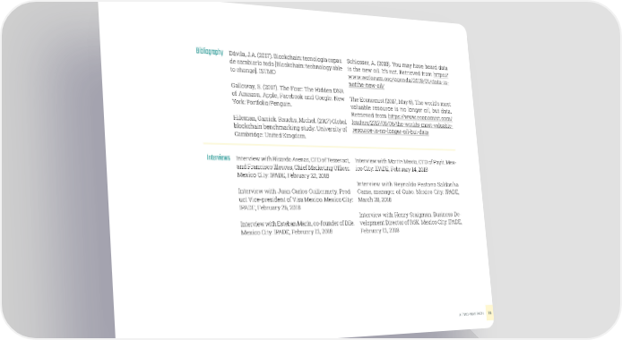 BibliographyDávila, J.A. (2017). Blockchain: tecnología capaz Schlosser, A. (2018). You may have heard data de cambiarlo todo [Blockchain: technology able is the new oil. It’s not. Retrieved from https:// to change]. ISTMO www.weforum.org/agenda/2018/01/data-is- notthe-new-oil/ Galloway, S. (2017). The Four: The Hidden DNA of Amazon, Apple, Facebook and Google. New The Economist (2017, May 6). The world’s most York: Portfolio/Penguin. valuable resource is no longer oil, but data. Retrieved from https://www.economist.com/ Hileman, Garrick. Rauchs, Michel. (2017) Global leaders/2017/05/06/the-worlds-most-valuable- blockchain benchmarking study. University of resource-is-no-longer-oil-but-data Cambridge: United Kingdom. Interviews Interview with Ricardo Arenas, CEO of Tesseract, Interview with Martín Mexía, CEO of Payit. Mex- and Francisco Illescas, Chief Marketing Oficer. ico City: IPADE, February 14, 2018 Mexico City: IPADE, February 22, 2018 Interview with Reynaldo Pestana Saldanha Interview with Juan Carlos Guillermety, Prod- Gama, manager of Cubo. Mexico City: IPADE, uct Vice-president of Visa Mexico. Mexico City: March 28, 2018 IPADE, February 26, 2018 Interview with Henry Sraigman, Business De- Interview with Esteban Marín, co-founder of Dile. velopment Director of RSK. Mexico City: IPADE, Mexico City: IPADE, February 12, 2018 February 12, 2018 A TWO-WAY PATH78