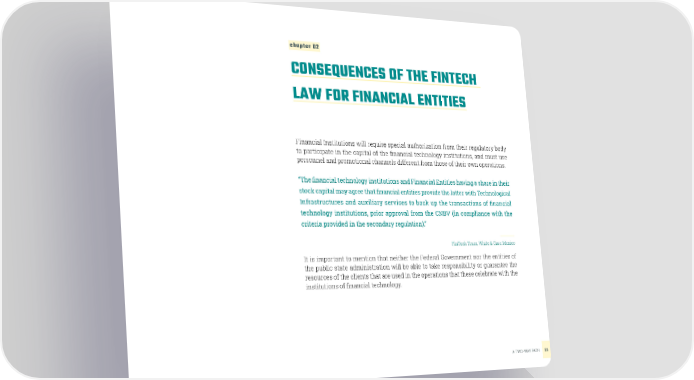 chapter 02 CONSEQUENCES OF THE FINTECH LAW FOR FINANCIAL ENTITIES Financial Institutions will require special authorization from their regulatory body to participate in the capital of the inancial technology institutions, and must use personnel and promotional channels different from those of their own operations. “The inancial technology institutions and Financial Entities having a share in their stock capital may agree that inancial entities provide the latter with Technological Infrastructures and auxiliary services to back up the transactions of inancial technology institutions, prior approval from the CNBV (in compliance with the criteria provided in the secondary regulation).” FinTech Team, White & Case Mexico It is important to mention that neither the Federal Government nor the entities of the public state administration will be able to take responsibility or guarantee the resources of the clients that are used in the operations that these celebrate with the institutions of inancial technology. A TWO-WAY PATH33