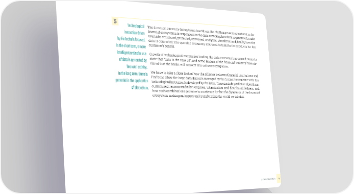 5 Technological The direction currently being taken to address the challenges and opportunities for innovation driven inancial ecosystems is respondent to the data economy: how data is generated, made available, structured, protected, conveyed, analyzed, visualized and, inally, how the by FinTechs is focused. data is converted into operable resources, and used to build better products for the In the short term, a more customer’s beneit. intelligent and safer use Growth of technological companies leading the data economy has caused many to of data is generated by state that “data is the new oil”, and some leaders of the inancial industry have de- clared that the banks will convert into software companies. inancial activity. In the long term, there is We have to take a close look at how the alliance between inancial institutions and FinTechs allow the large data deposits managed by the former to combine with the potential in the application technological instruments developed by the latter. These include predictive algorithms, of blockchain.customized recommendation engines, tokenization and distributed ledgers, and how such combinations promise to accelerate further the dynamics of the inancial ecosystem, making an impact and transforming the world we inhabit. A TWO-WAY PATH9