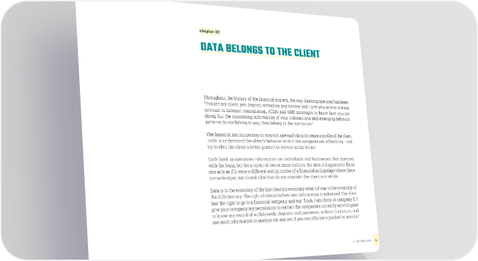 chapter 02 DATA BELONGS TO THE CLIENT Throughout the history of the inancial system, the way Banking operates has been: “You are my client, you deposit, withdraw, pay, borrow and I give you access to bank account or Internet consultation, ATMs and SMS messages to know how you are doing, but the outcoming information of your transactions and emerging behavior patterns do not belong to you, they belong to the institution.” The inancial institution may or may not use such data to create a proile of the client ‒tools to understand the client’s behavior within the competences of banking - and try to offer the client a better product or service in the future. Each bank accumulates information on individuals and businesses that operates with the bank, but for a client of two or more entities, the data is fragmented. Each one acts as if it were a different entity, circles of a inancial archipelago where there are no bridges, but closed silos that do not consider the client as a whole. Data is to the economy of the 21st Century economy what oil was to the economy of the 20th Century. The right of clients to their own information is enhanced. The client has the right to go to a inancial company and say: “Look, I am client of company B, I give your company my permission to contact the companies currently servicing me to know my record of withdrawals, deposits and payments, without limitation, and use such information to analyze me and see if you can offer me a product or service.” A TWO-WAY PATH25